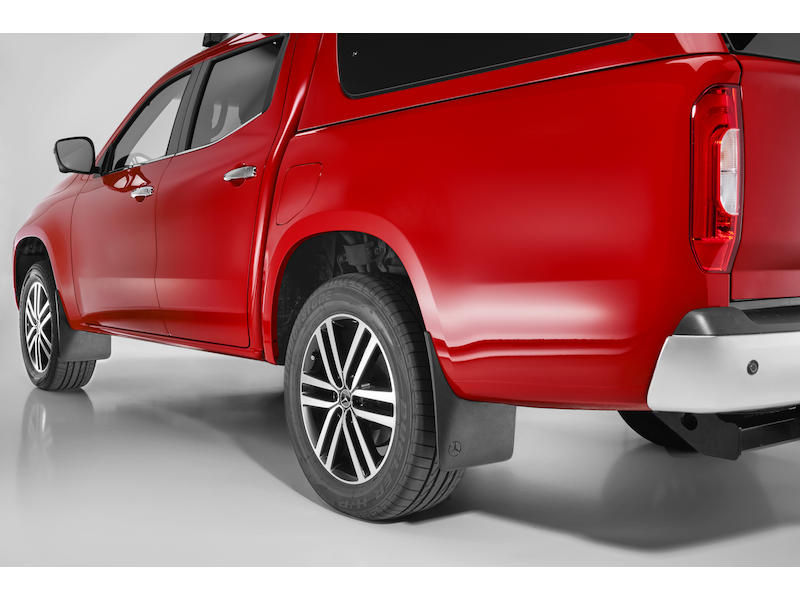 The mud flaps are precision-tailored to the contours of the vehicle. They have a dynamic look, ensuring that the vehicle's appearance is not affected. The high-quality material is extremely hard-wearing, durable and UV-resistant.